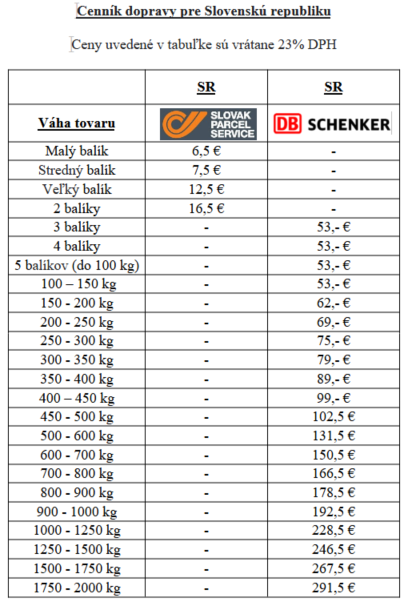 Pri objednávke do 650,- EUR vrátane DPH je cena dopravy podľa vyššie uvedeného cenníka v závislosti na celkovej váhe objednávky.